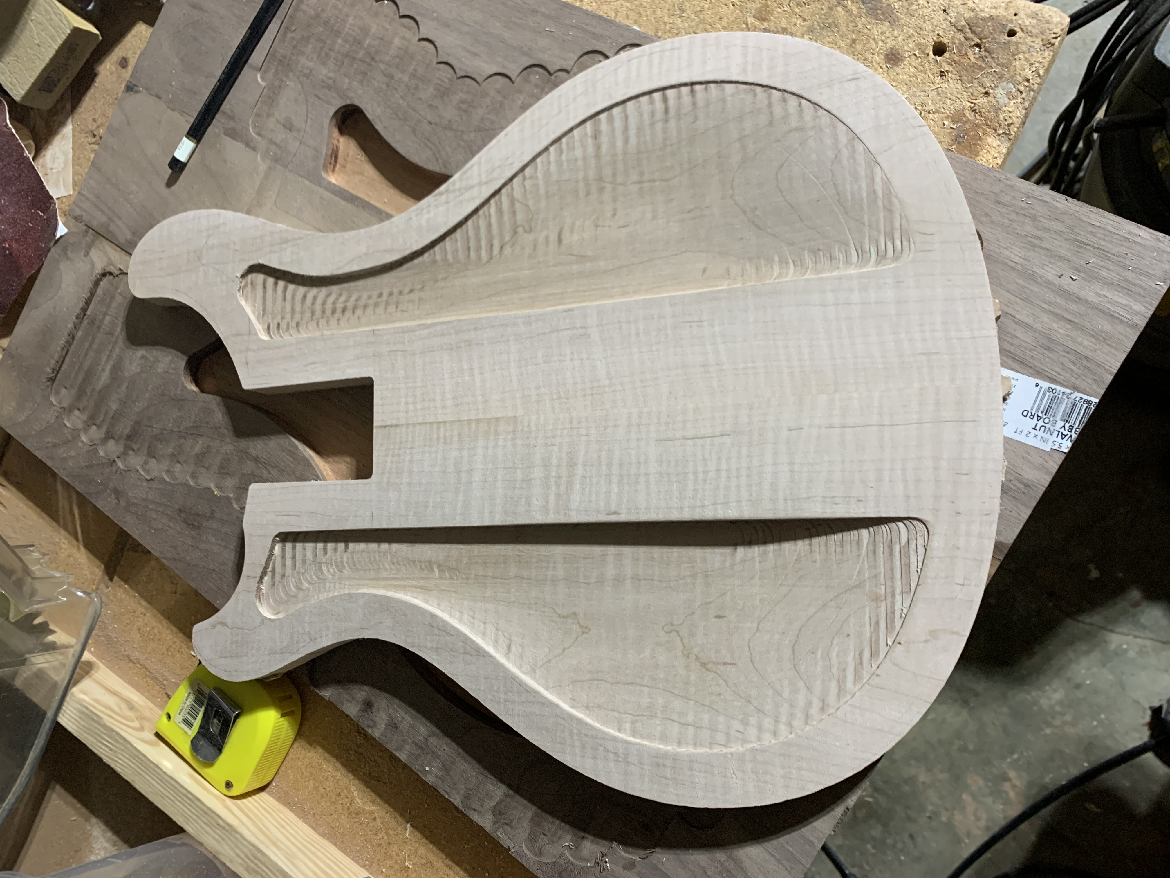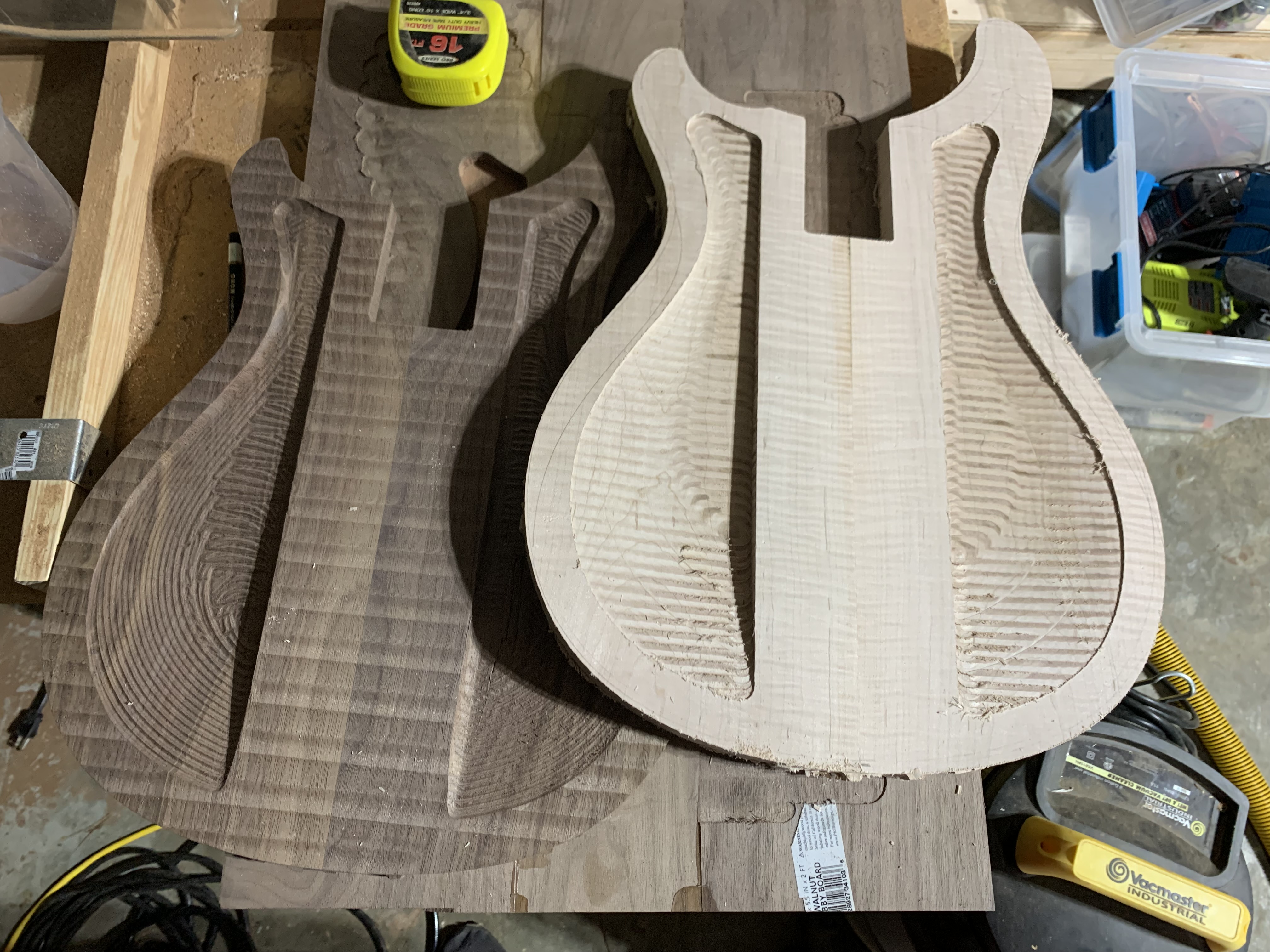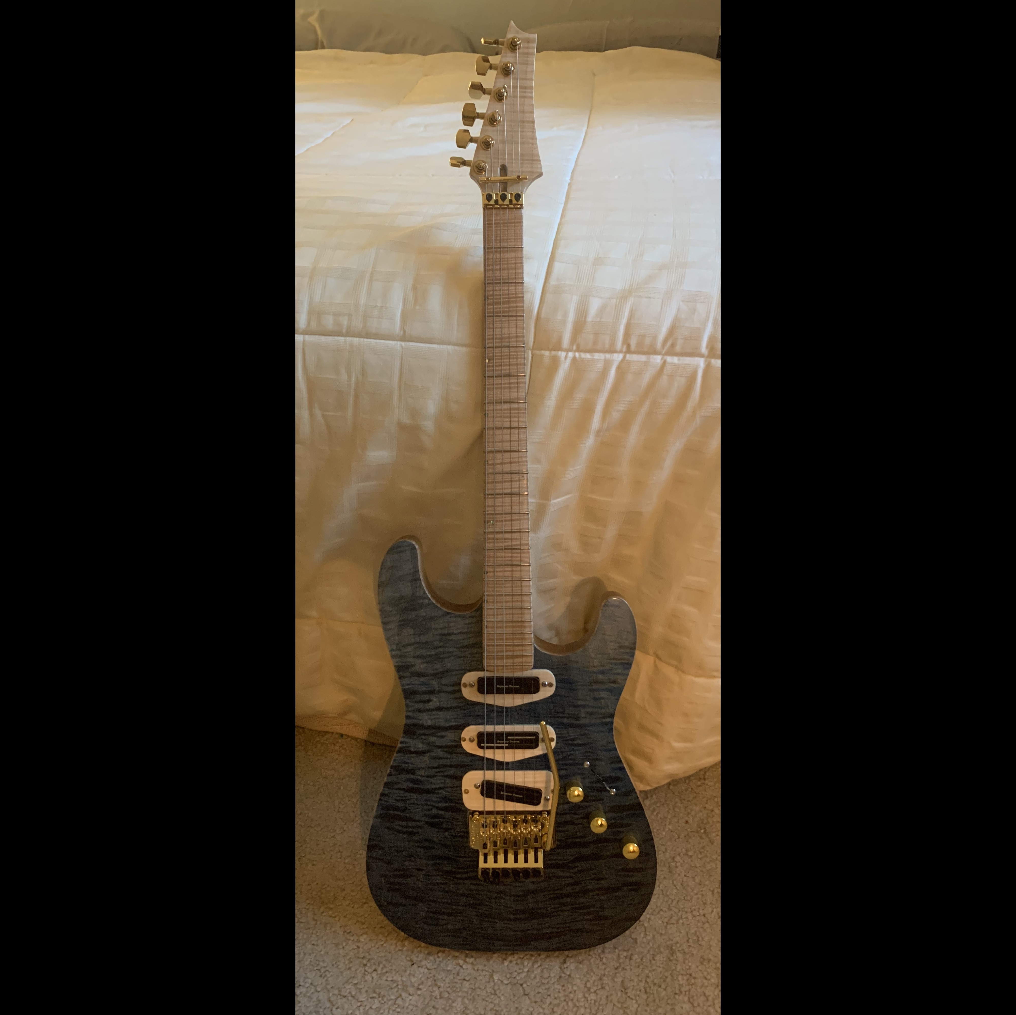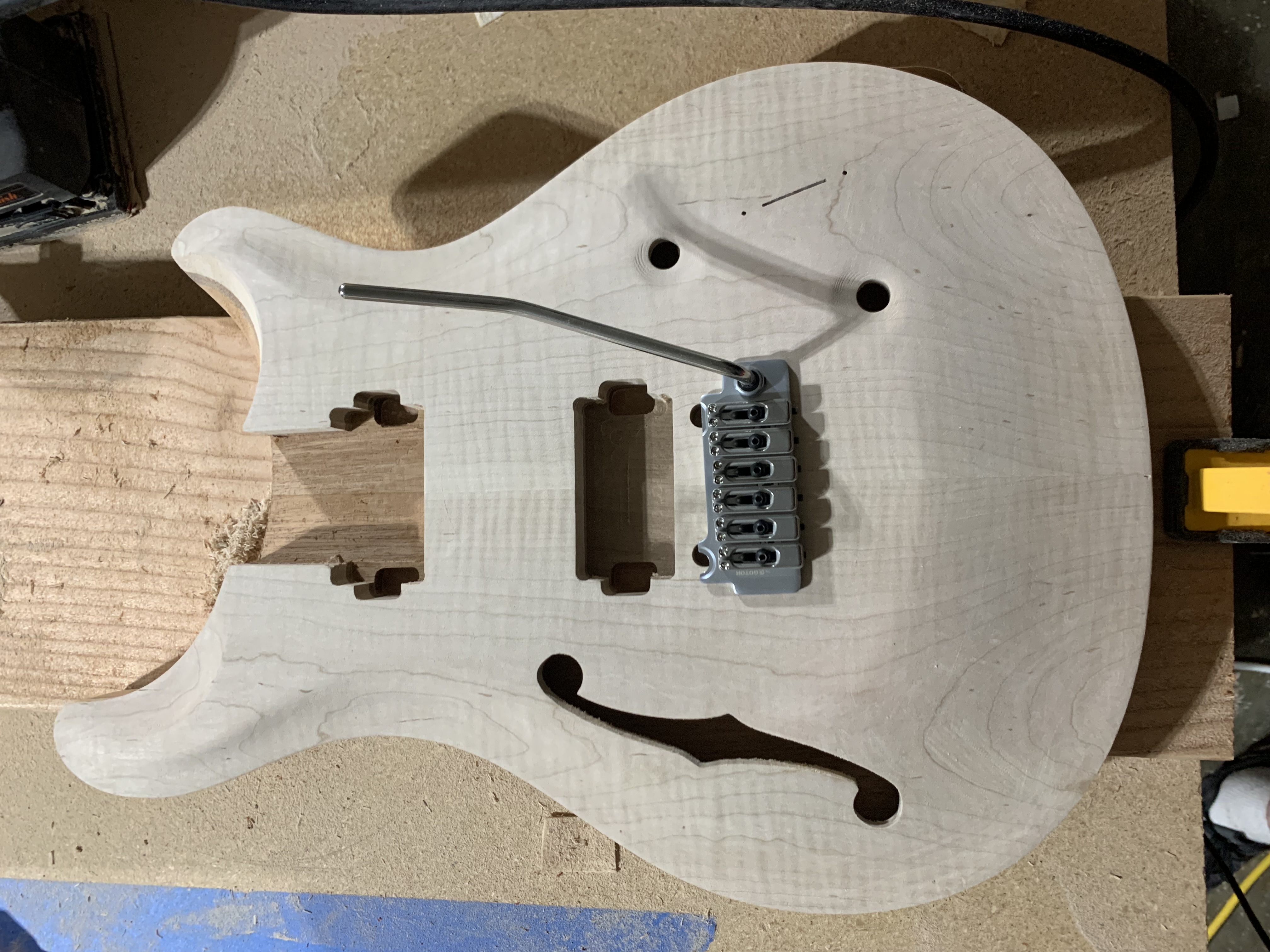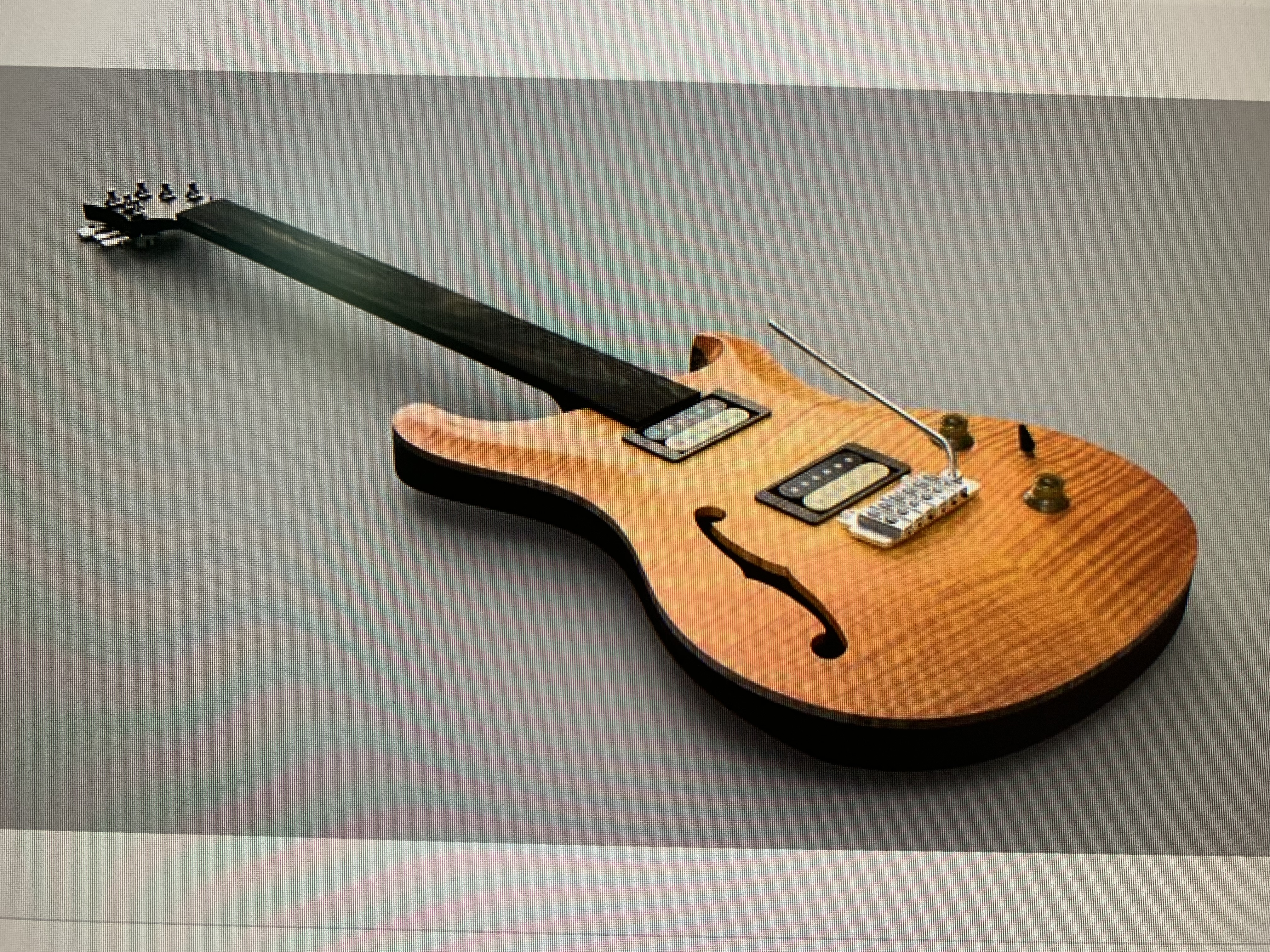 My second guitar design is based off the PRS Custom 24 model. I wanted to try to replicate the design with some of my own touches and a semi-hollow body for a warmer tone. It features a curly maple curved top and a mohogany back. I am still in the process of building this guitar.
